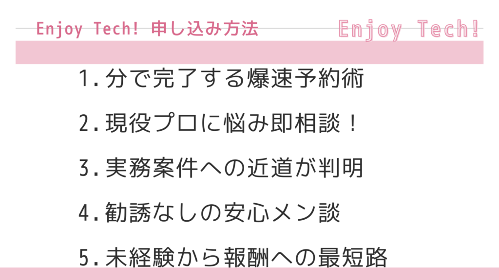 まずは「Enjoy Tech! 申し込み方法」に従って無料相談の枠を確保し、あなた専用の最短スケジュールを現役エンジニアに提示してもらいましょう。